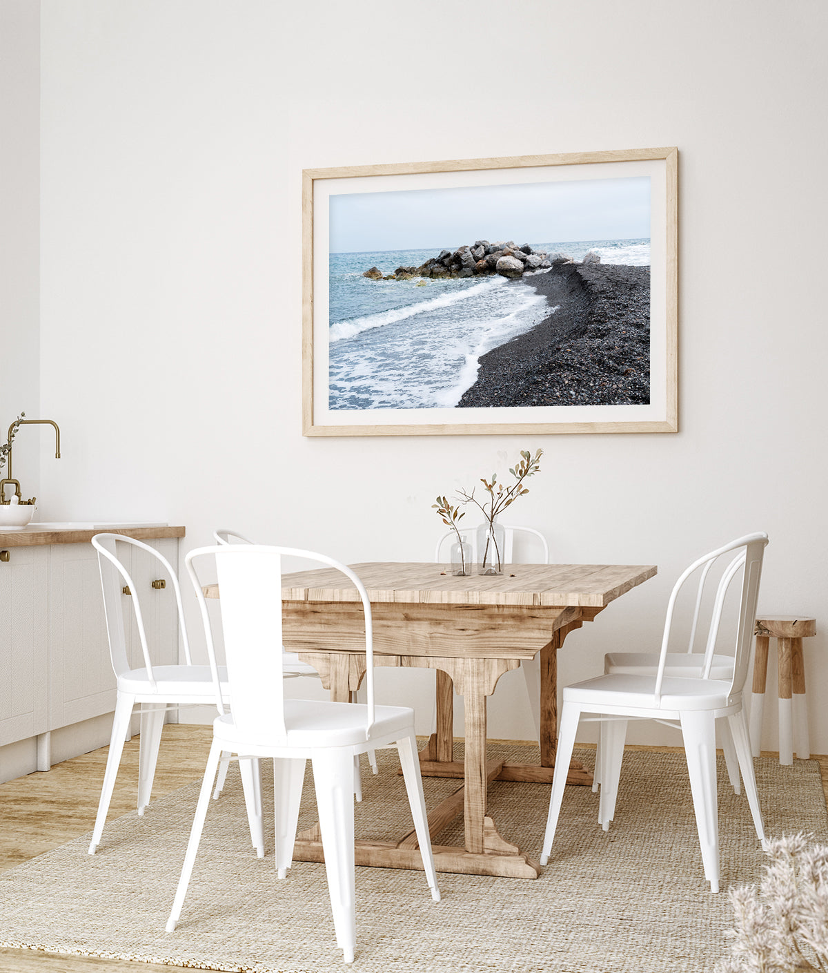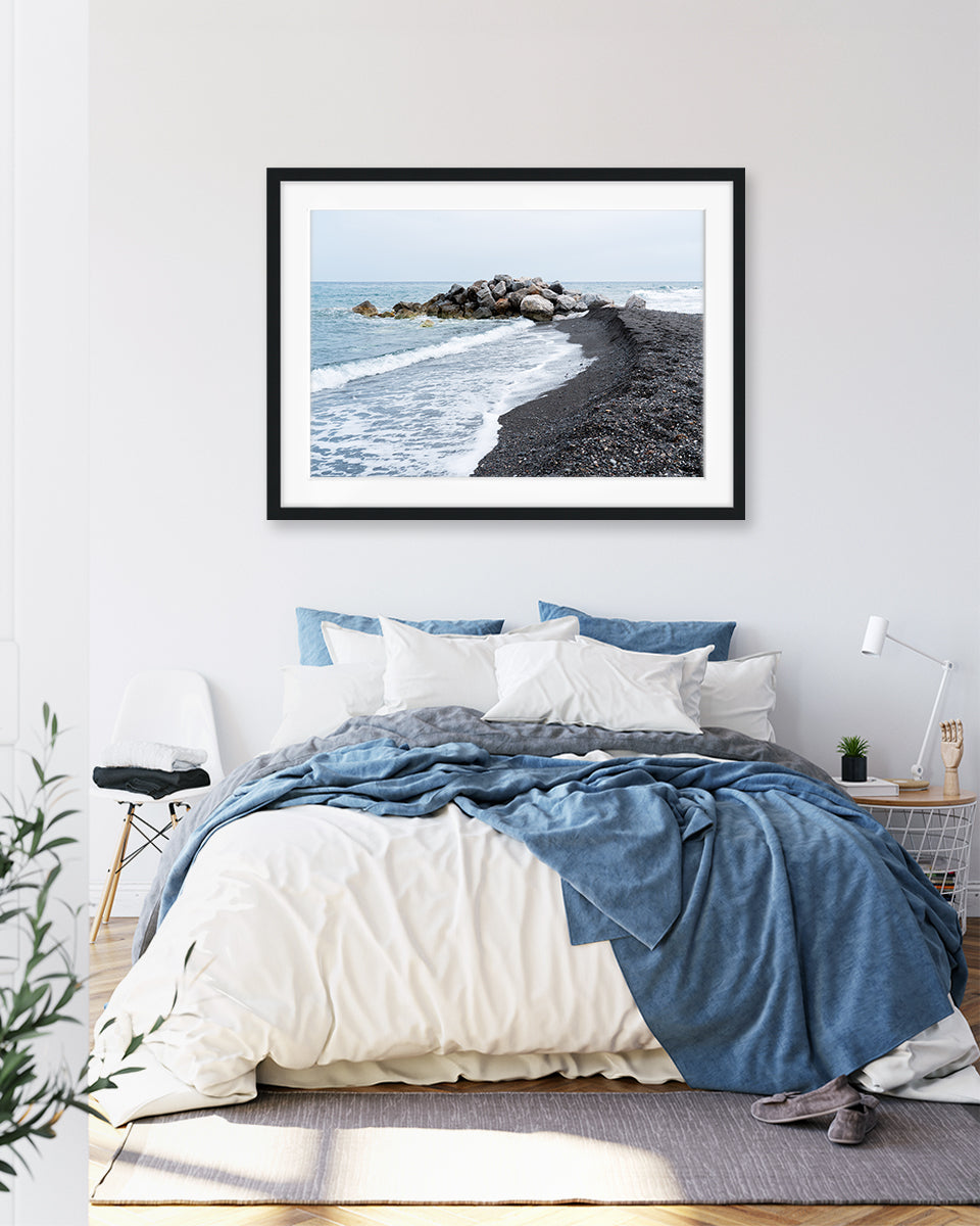 This beach print features a black sand beach on a cool, blue day in the Greek Islands. This fine art photograph of Black Beach in Santorini, Greece brings a calmness to your home decor through the muted blue and black tones.