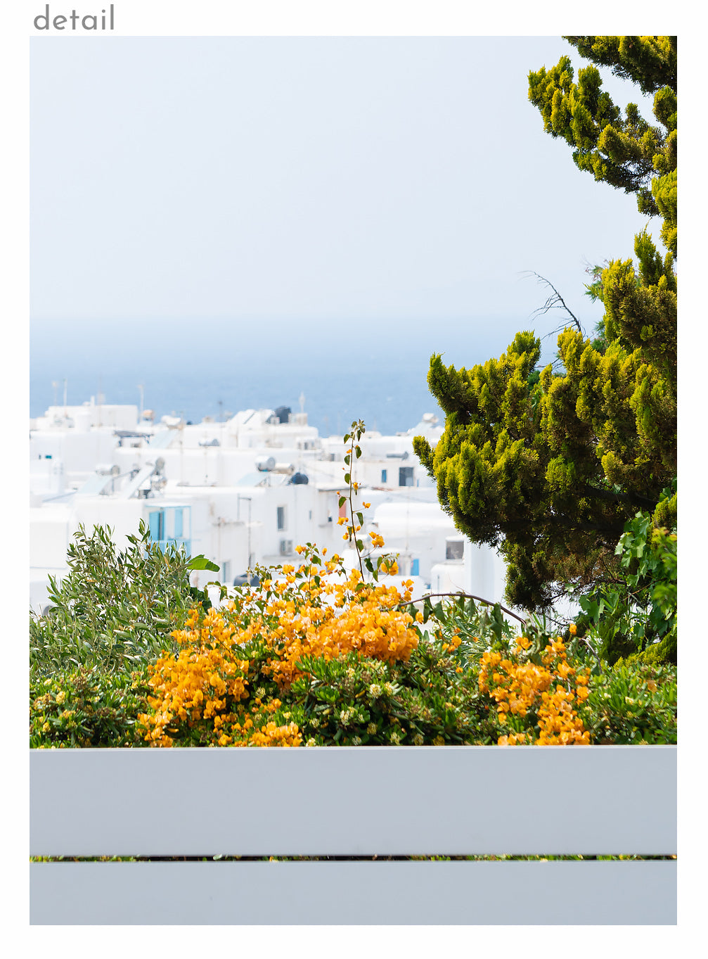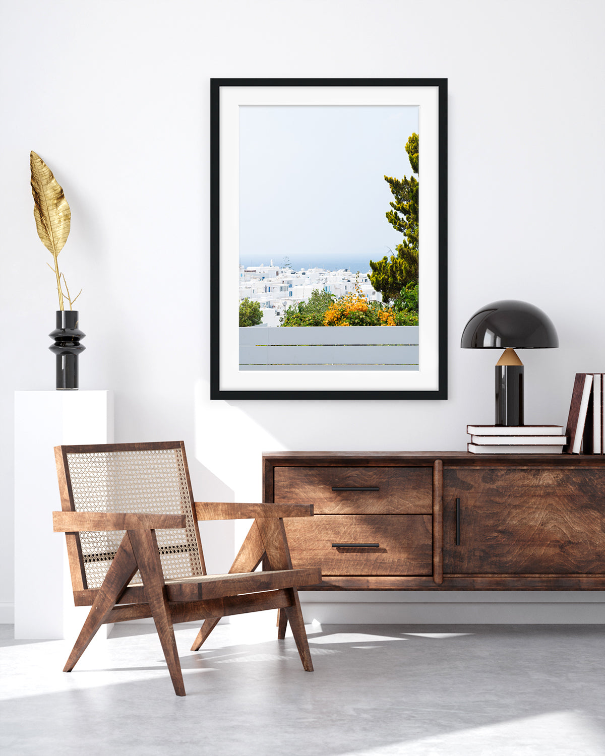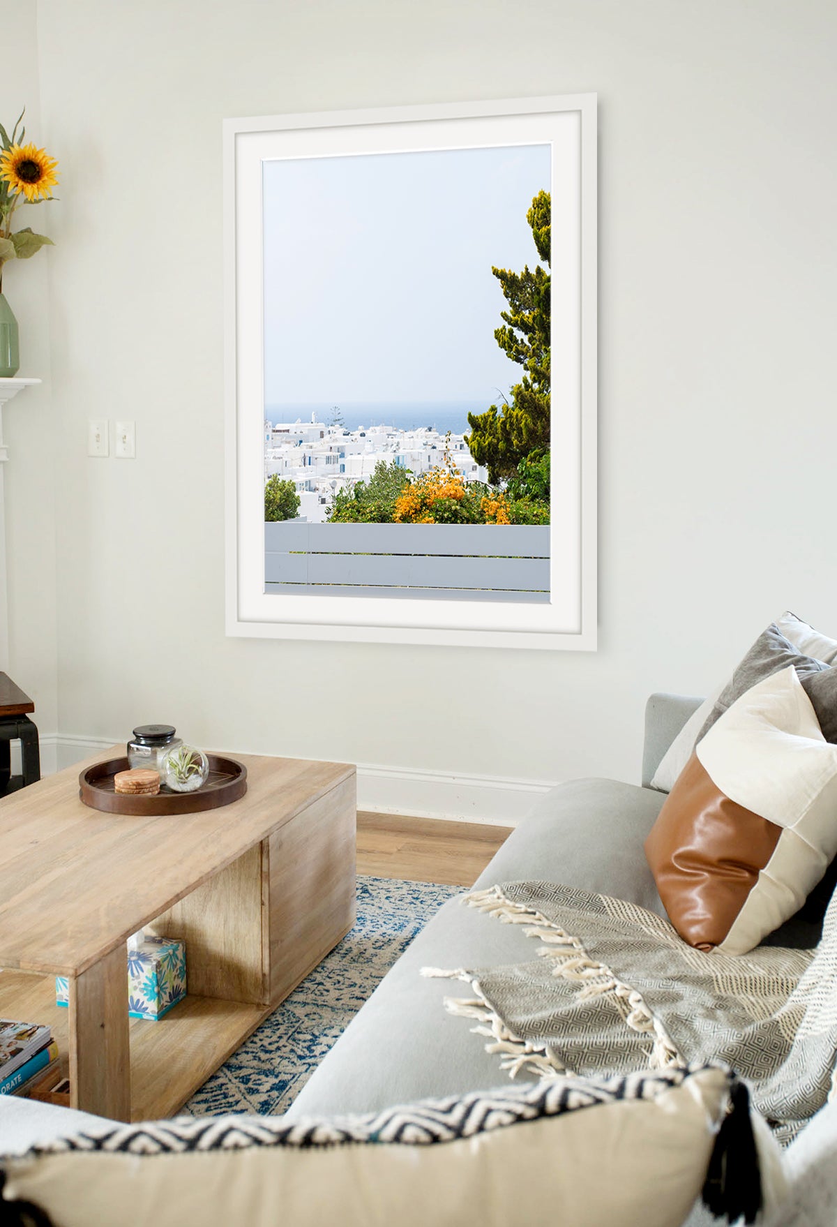 Look off into the distance at beautiful Mykonos, just beyond the ledge. This travel photograph was taken in Mykonos, Greece, and features a minimal print with detailed florals in the foreground and the tops of the white Greecian buildings fading into the background.